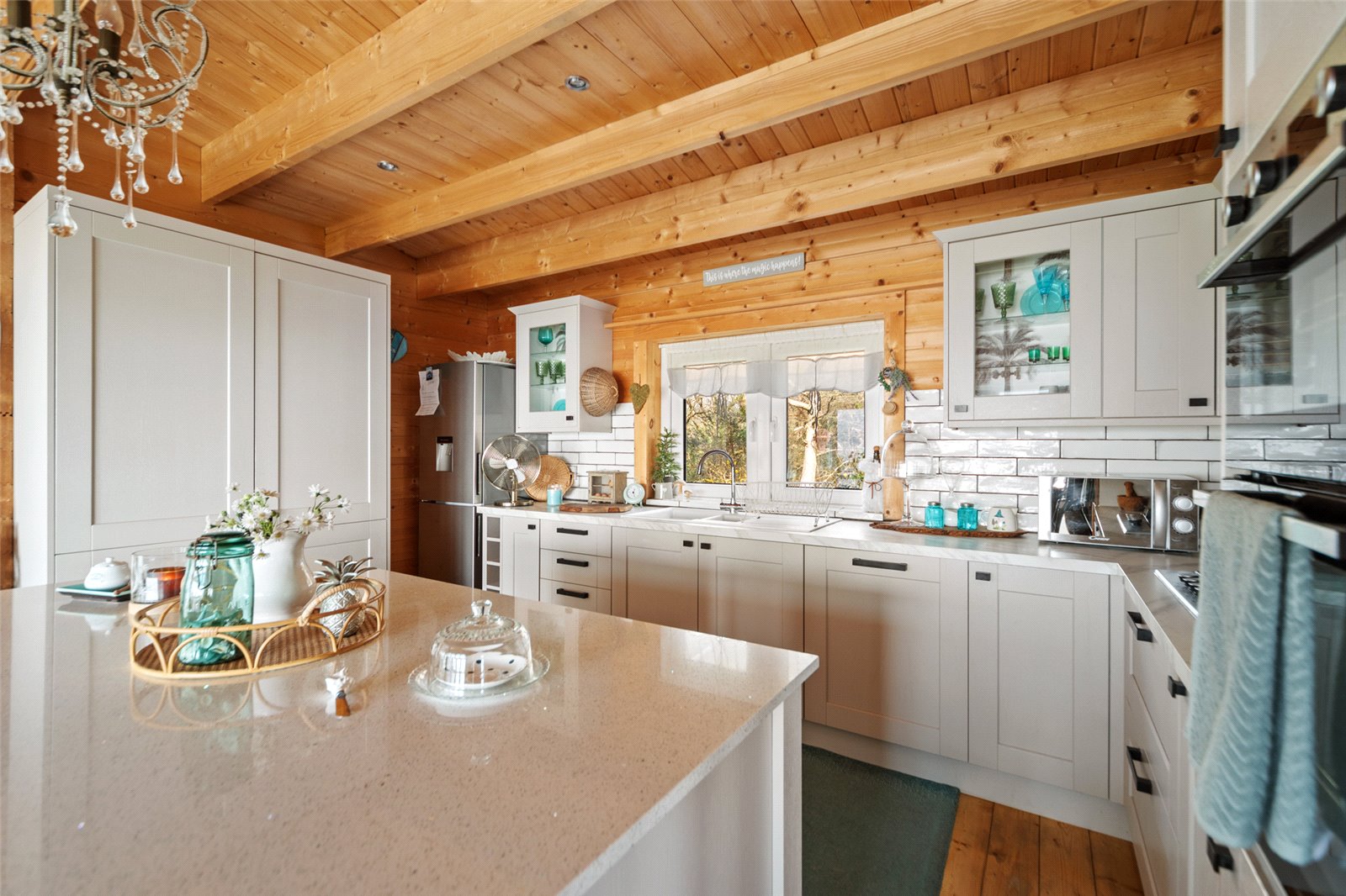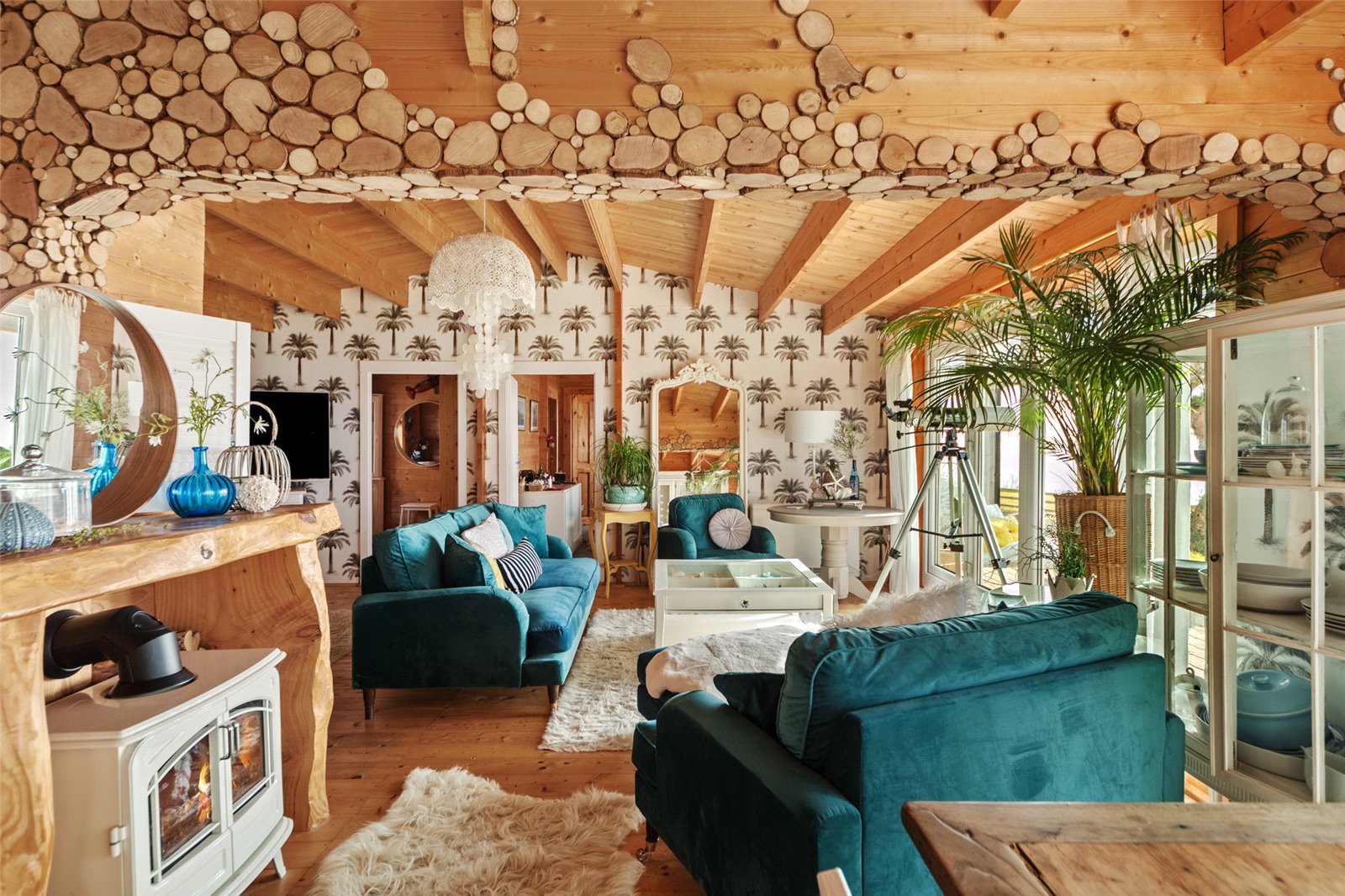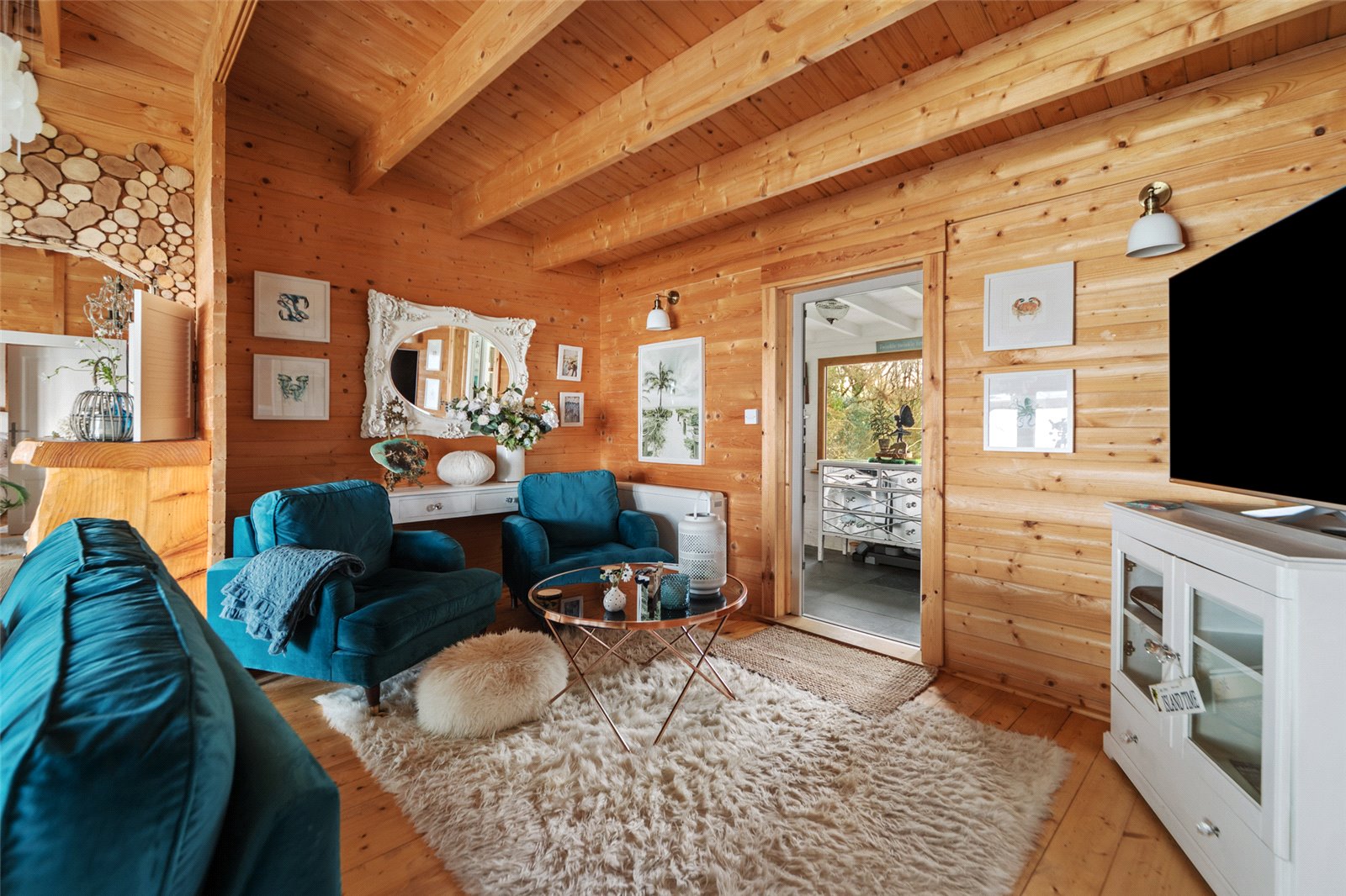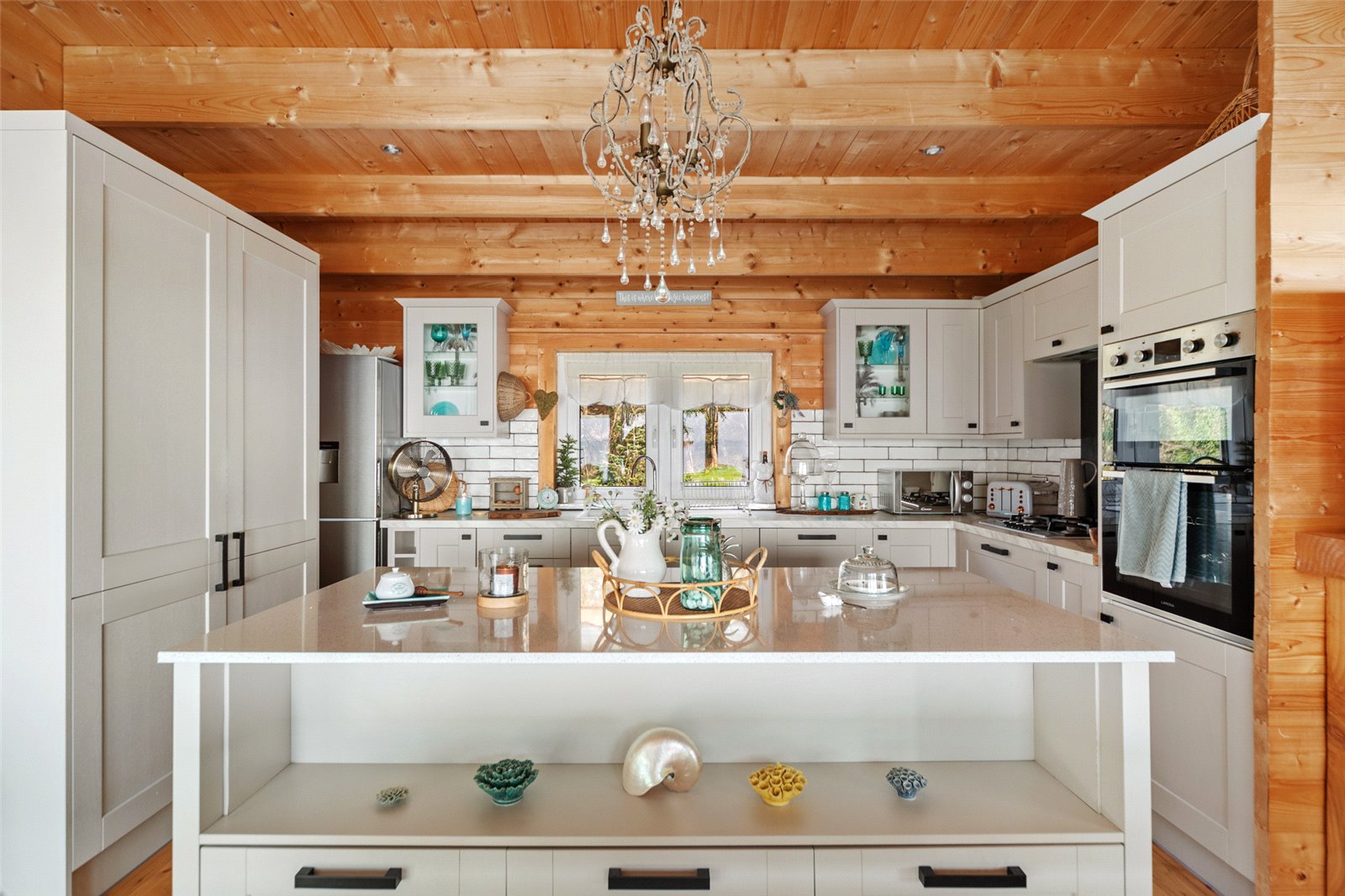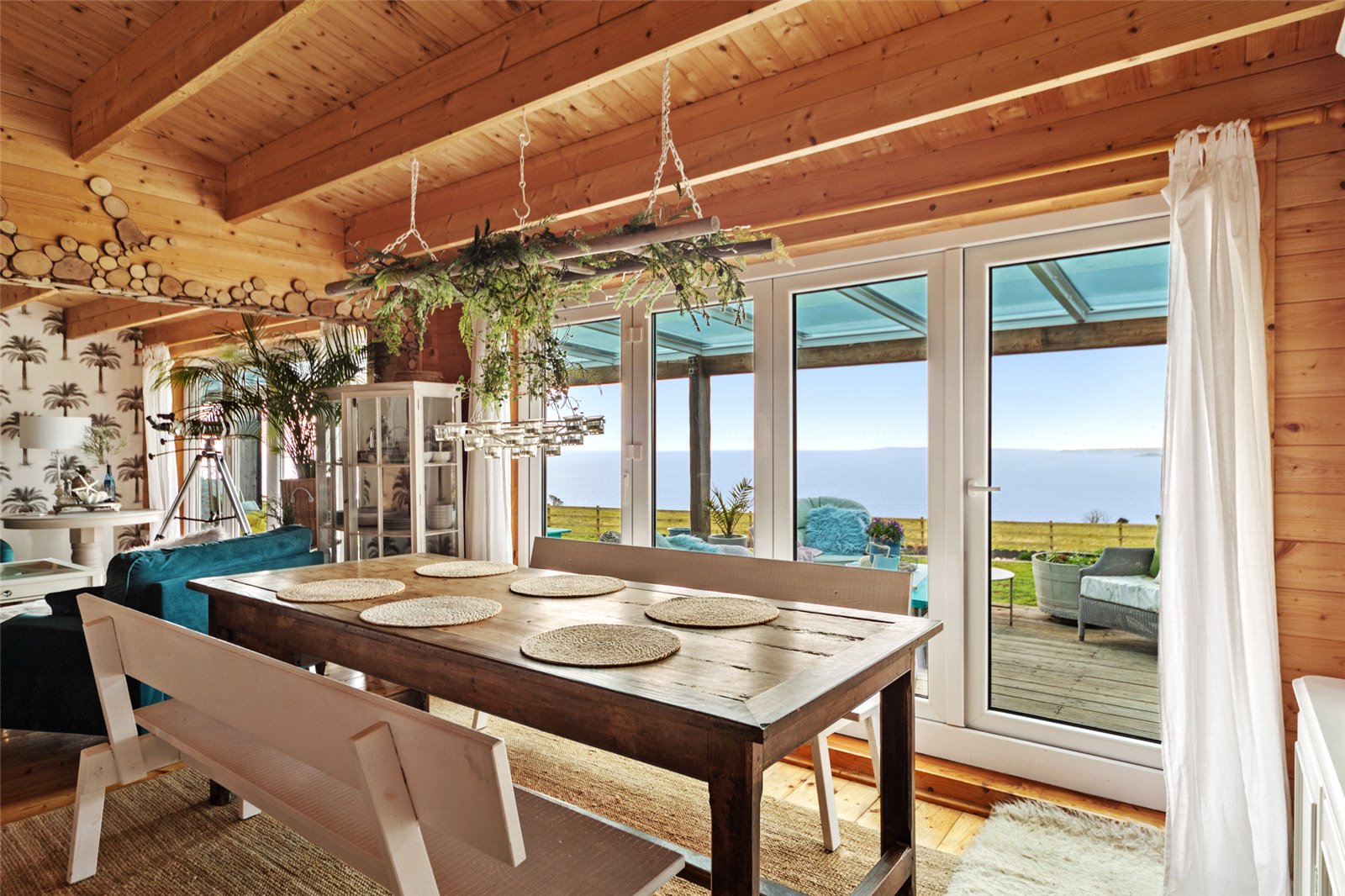 Acting as a lobby and central hub for the property, the dove grey fitted kitchen is a paradise for any home cook offering stunning views to both aspects. Featuring a 1.5 ceramic sink unit, integrated double oven/grill, dishwasher, 4 ring LPG hob with extractor and fridge freezer. The double glazed window to the rear provides an outlook over the fairy-tale rear garden and the outskirts of woodland. Bi-fold doors to the fore perfectly frame the spectacular coastal views, affording direct access to the deck.