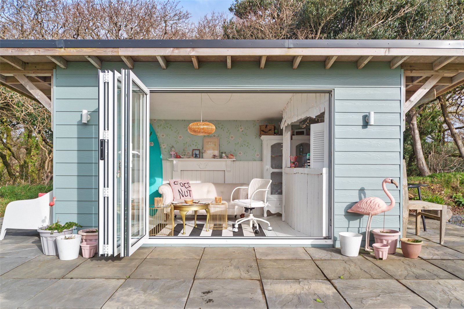 Outside, a charming summer house doubles as a serene home office, providing a tranquil retreat for work, creative pursuits or get-togethers with friends and family. Surrounded by verdant gardens and overlooking the sparkling waters below, this intimate space offers inspiration and productivity in equal measure. As you step outside to the back garden, you are enveloped by the gentle whisper of leaves rustling in the breeze and the symphony of birdsong from the neighbouring ancient forest.