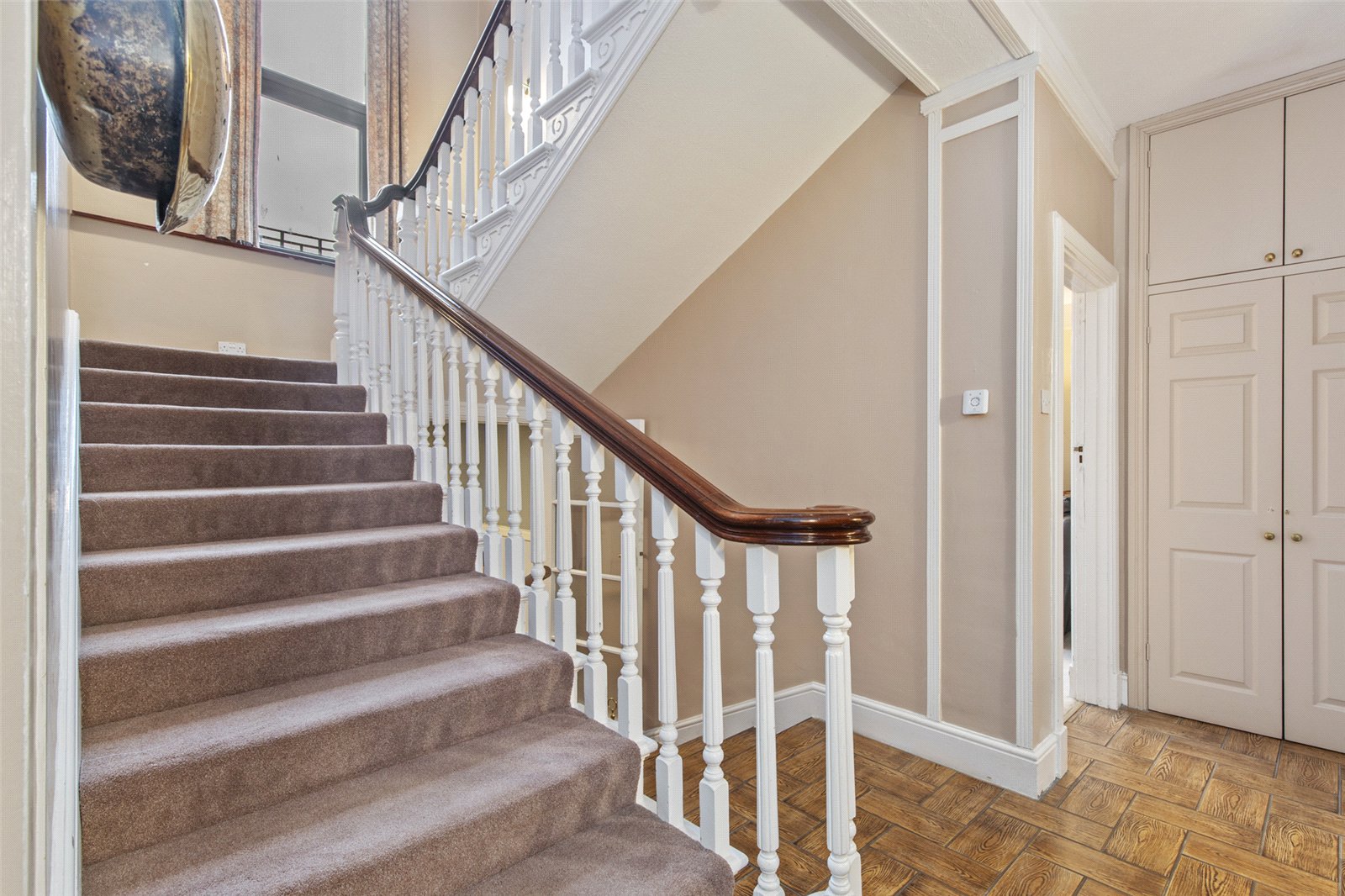 The large sitting room features an open gas fire and stunning harbour views with bespoke privacy glass panelling. The rear of the living room features a built in library.