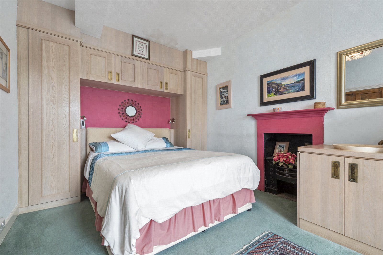 A charming double bedroom with a rich palette and ample storage, this space combines classic comfort with bold character. Custom-fitted wardrobes and overhead cabinets offer plenty of storage while maintaining a cohesive design. A striking fireplace adds a vibrant touch, and the front of the bedroom enjoys breath-taking views of the harbour, complete with a window seat — the perfect blend of practicality and charm.