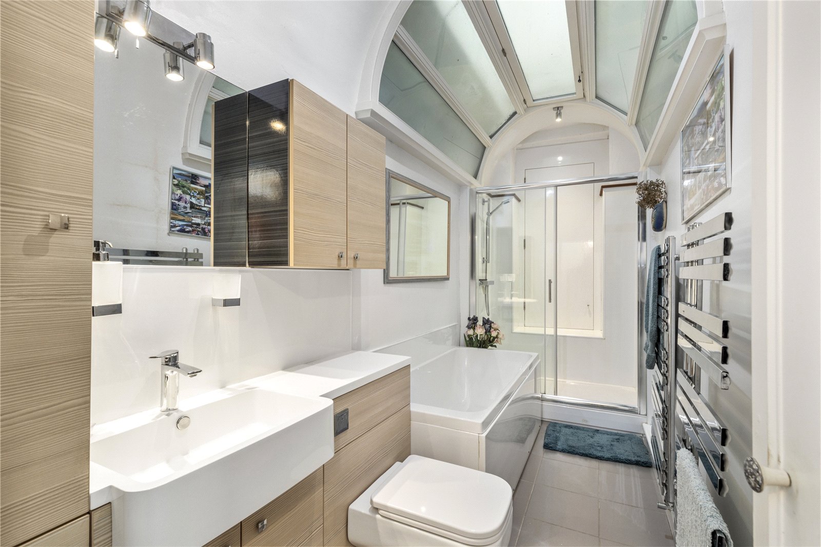 Contemporary fittings continue throughout, including a wall-hung WC and a polished chrome heated towel rail for added comfort. Neutral tones, glossy tiles, and understated décor give the space a spa-like feel—ideal for unwinding after a long day.