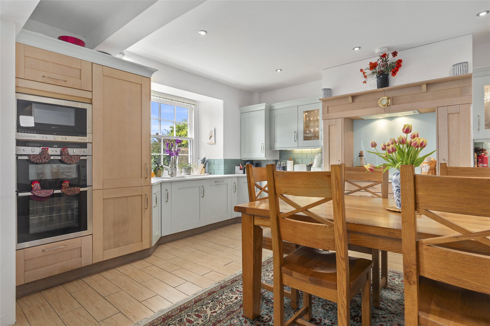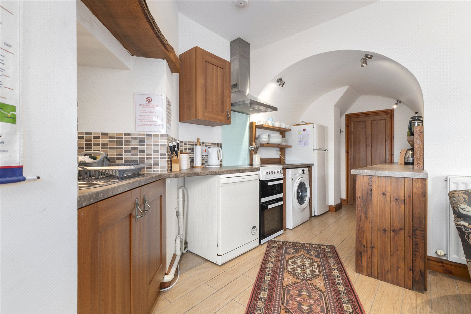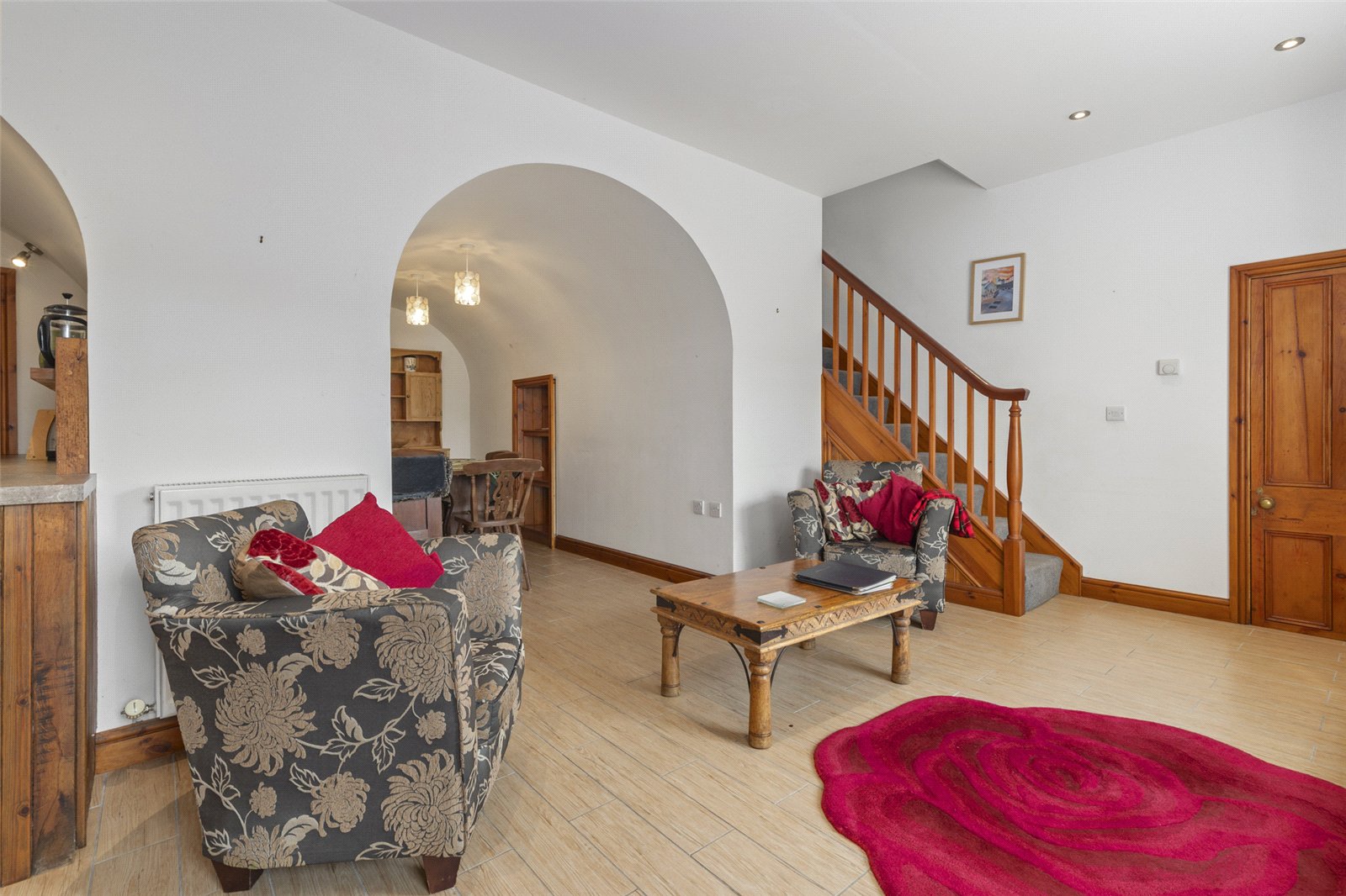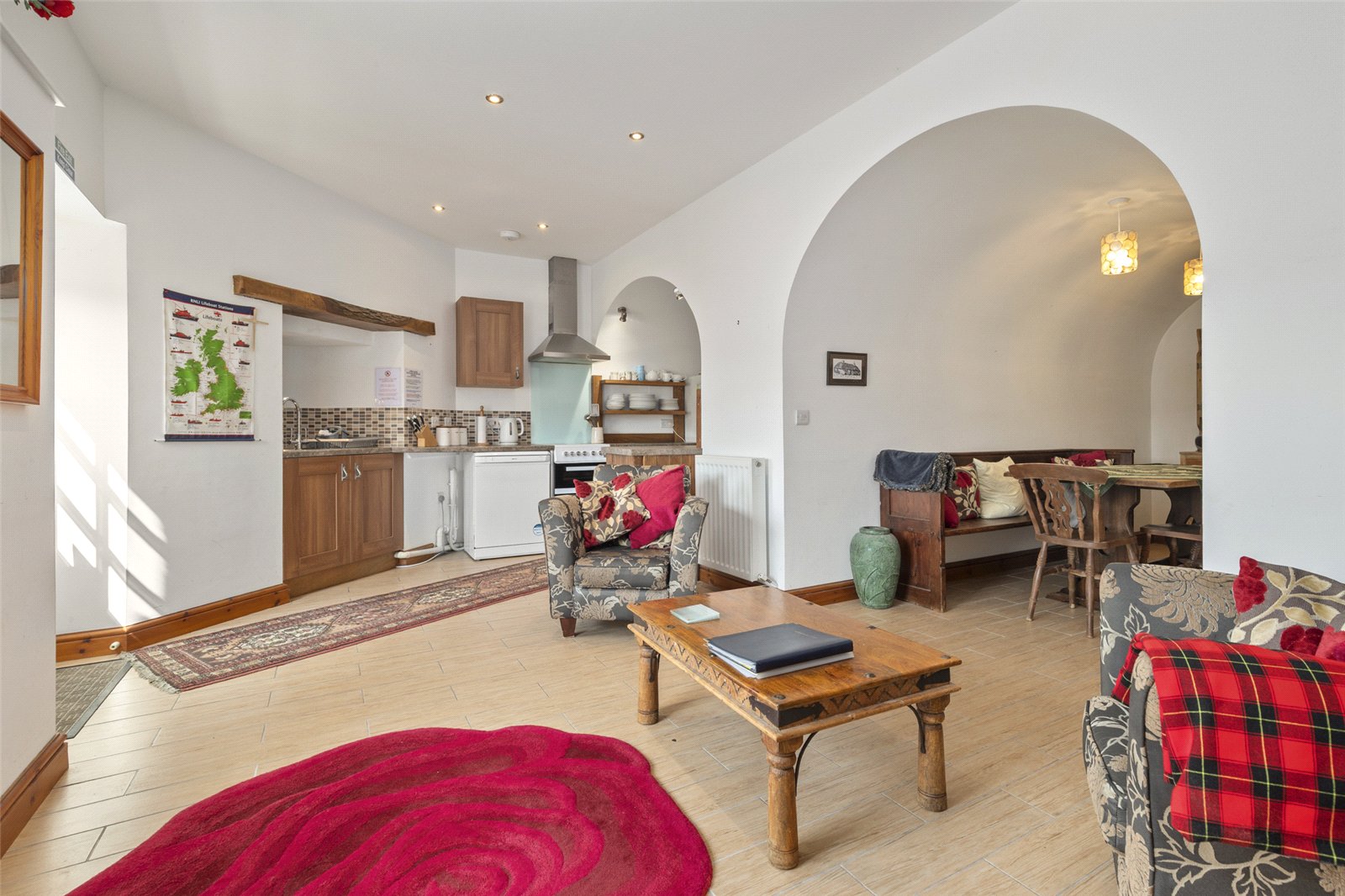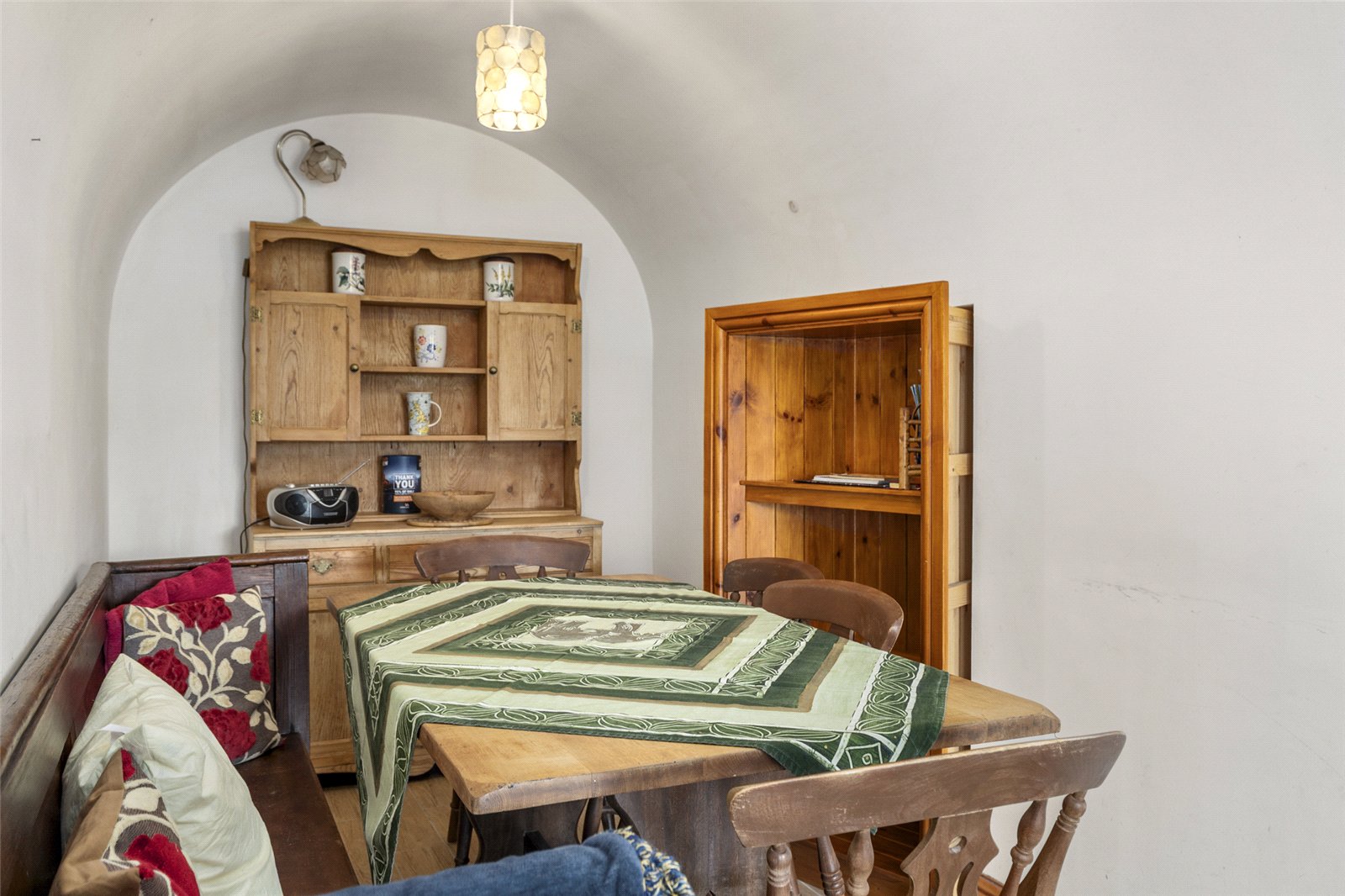 Currently utilised as a self-contained second residence, the space comprises an elegant kitchen/dining room and a generous living area, both set beneath striking arched ceilings that add to the home’s historic charm.
