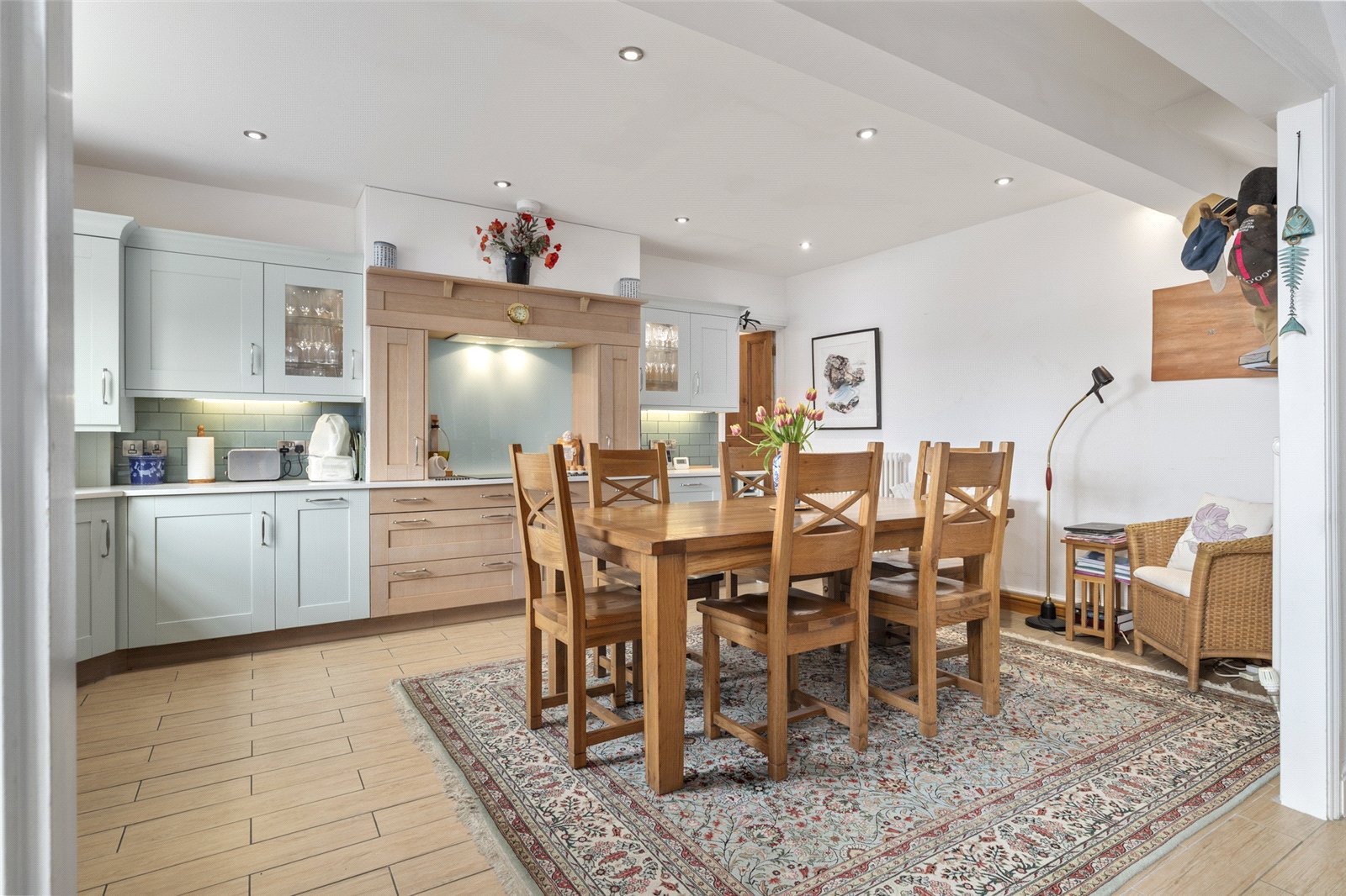 The kitchen and dining areas are combined, enhancing the sense of space and making it ideal for family gatherings or entertaining. Multiple recessed LED spotlights, providing bright, even lighting. Pale blue shaker-style cabinetry with chrome handles, offering a fresh and airy feel. Glass-fronted upper cabinets. Integrated stovetop under a light wood cooker hood surround with decorative corbels. Under-cabinet lighting adds both functionality and ambiance. This kitchen balances functionality with comfort, traditional touches with subtle modern updates, and creates a lived-in, welcoming atmosphere. Stunning outlook onto private patio with harbour views.