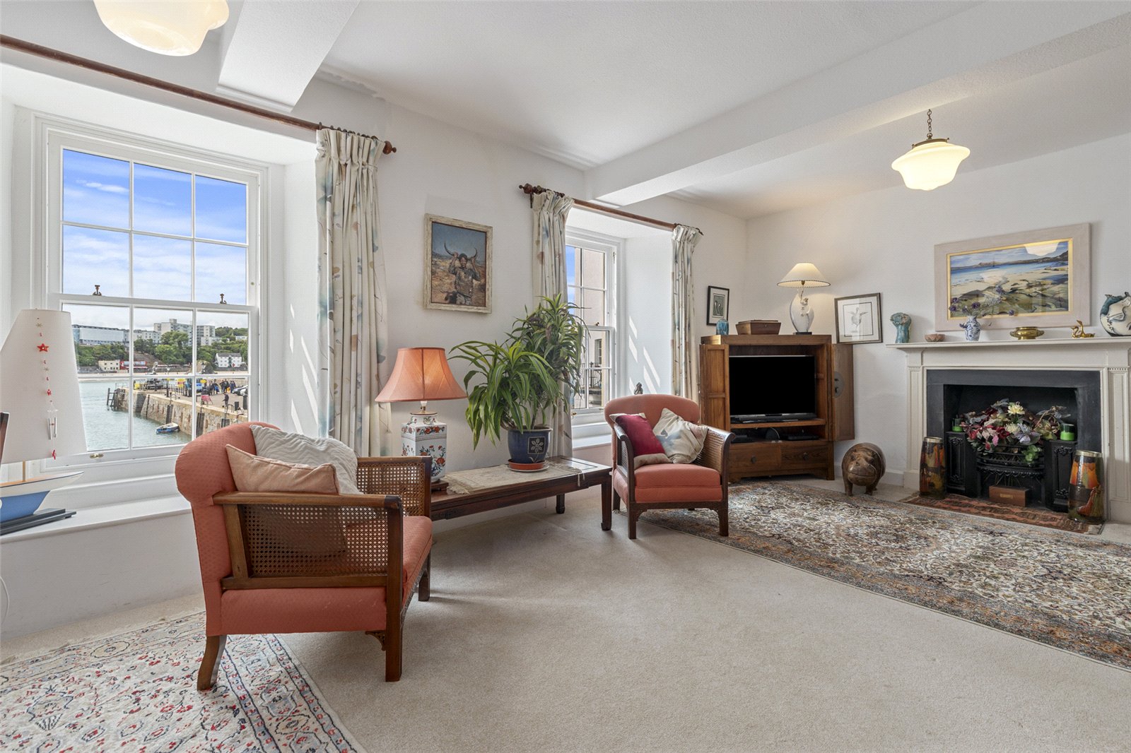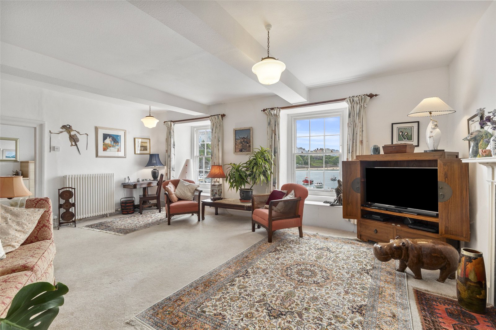 This delightful lounge offers an exceptional living space where classic character meets a breathtaking coastal outlook. Bathed in natural light from twin sash windows, the room boasts uninterrupted views across the picturesque harbour—creating a serene backdrop ideal for both everyday relaxation and entertaining.